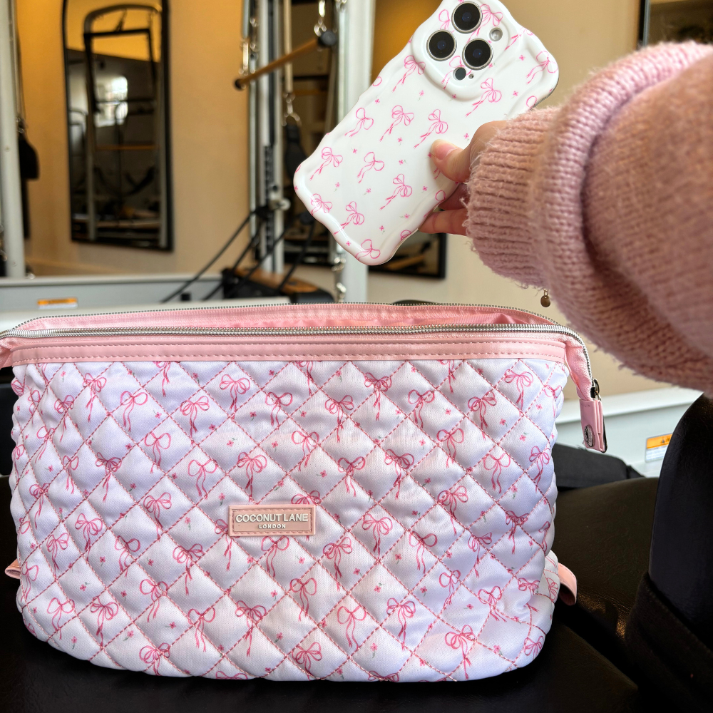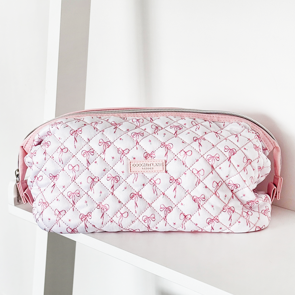 Dit charmante tasje heeft een gewatteerde textuur versierd met delicate fijne strikjes, waardoor het de perfecte mix van praktisch en mooi is. Of je nu je schoonheidsbenodigdheden, technische accessoires of kleine schatten organiseert, dit tasje is er om alles op de meest stijlvolle manier veilig te houden!